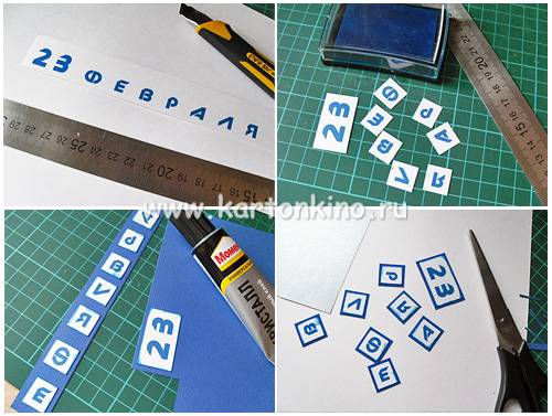 размер цифр 48, букв – 30).Вырезаем отдельно каждую букву “квадратиком”, тонируем края и наклеиваем
